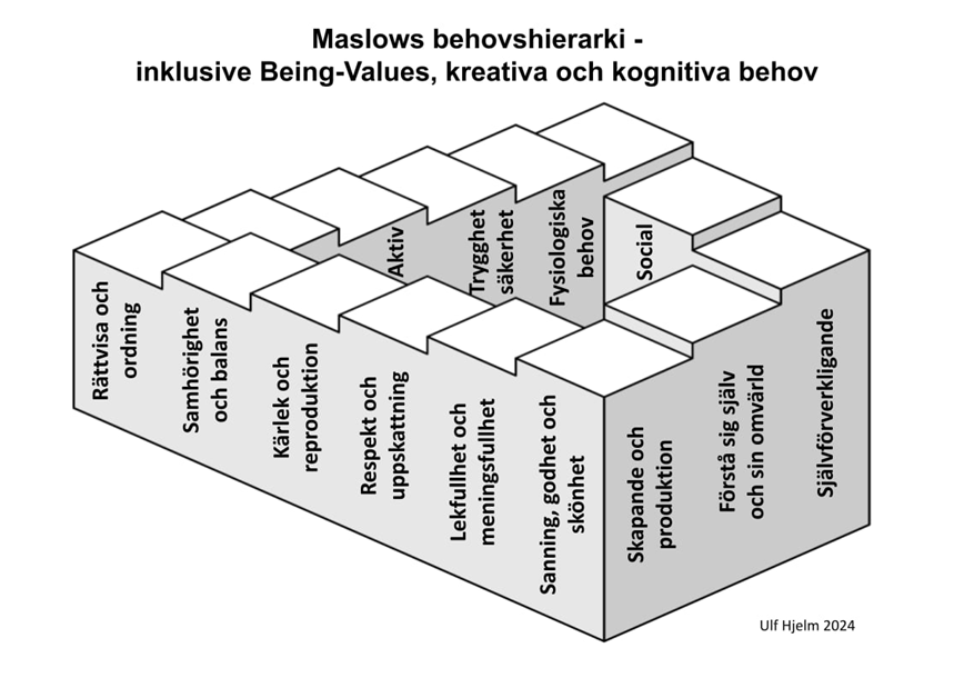 Min modell ovan illustrerar endast en aspekt av Abraham Maslows motivationspsykologi, att det finns många mänskliga behov att tillgodose och att de grundläggande behoven samverkar med människans kognitiva, moraliska, kommunikativa och kreativa behov.